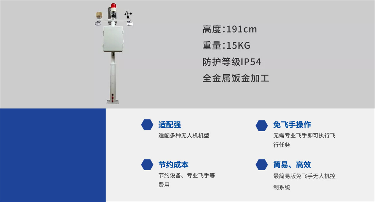 桅杆简易机巢,在支持气象五要素的基础商上,融入了自动机巢的核心功能,是行业入门级无人机控制系统。